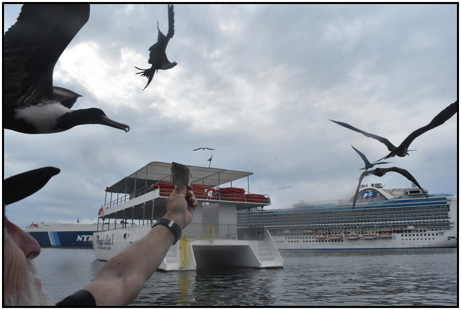 Bird encounters included the big pelican that joined us on the front of the boat and several big frigate birds that would swoop down to take fish from your hand.