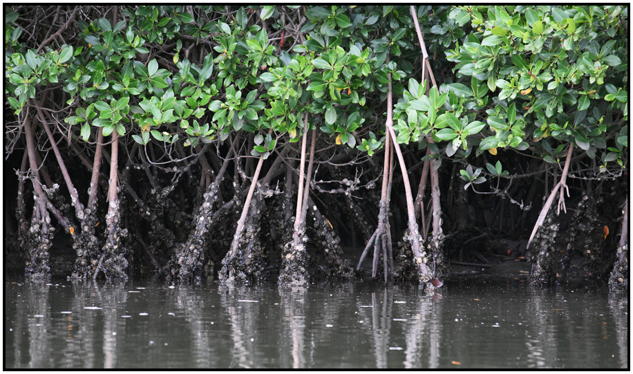 Close look at mangrove roots covered with barnacles, King David Bird Watching Tour, Mazatlan, Sinaloa, Mexico, 2019.