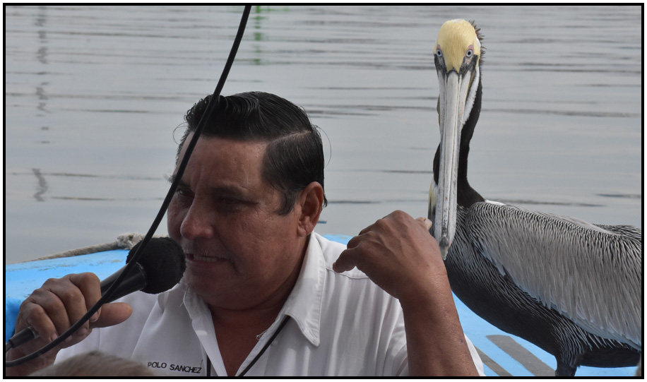 Our guide, Polo Sanchez, introduces us to his wild friend who escorted us through much of our cruise, King David Bird Watching Tour, Mazatlan, Sinaloa, Mexico, 2019.