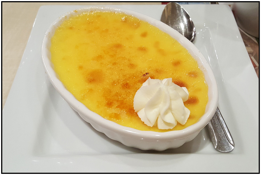 Creme brulee dessert, San Antonio Winery, Los Angeles, California, USA, 2017.