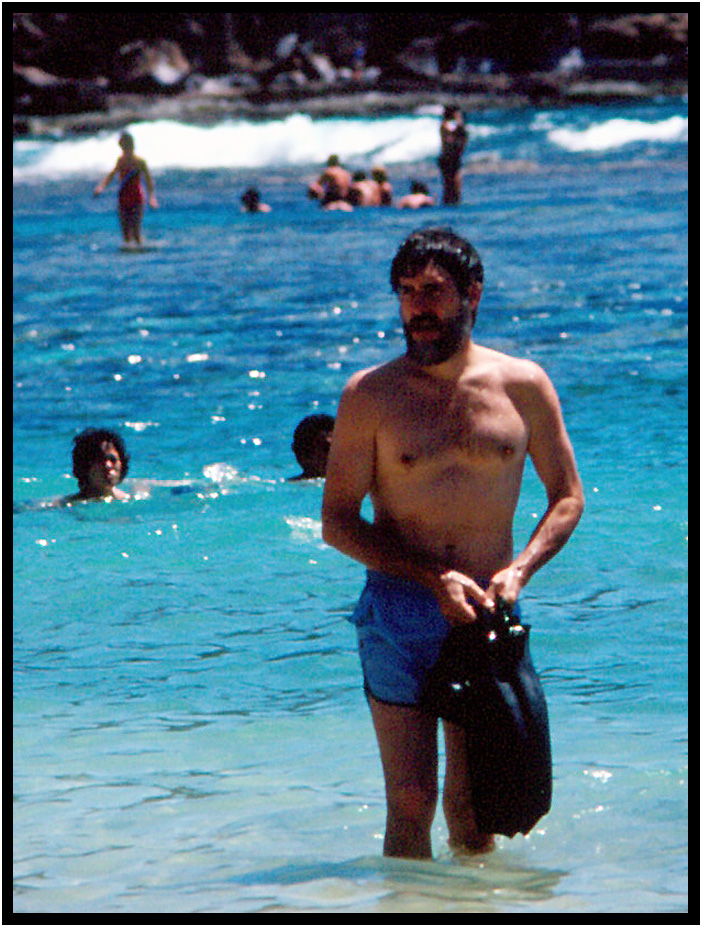 I had to bring my own fins because no one had ones big enough for my fat feet, Hanauma Bay, Oahu, Hawaii, 1983.