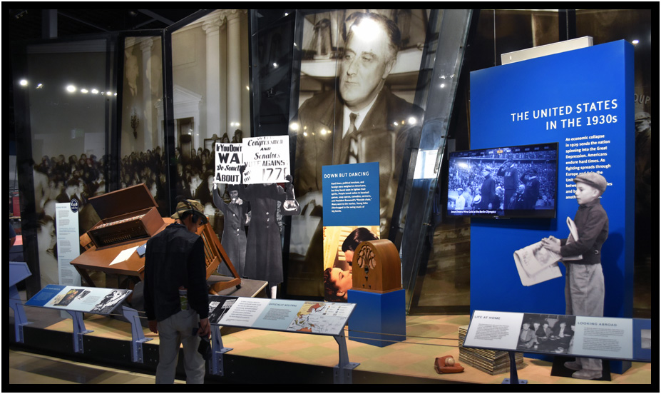 This museum exhibit starts with an outline of events in the 1930s that led up to Pearl Harbor, World War II Valor in the Pacific National Monument, Pearl Harbor, Oahu, Hawaii, USA, 2019.