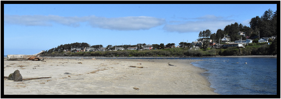 Yachats River estuary where it empties into the Pacific Ocean, Yachats, Oregon, USA, 2019.