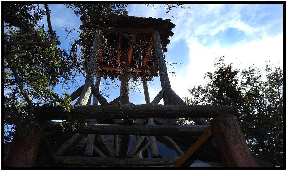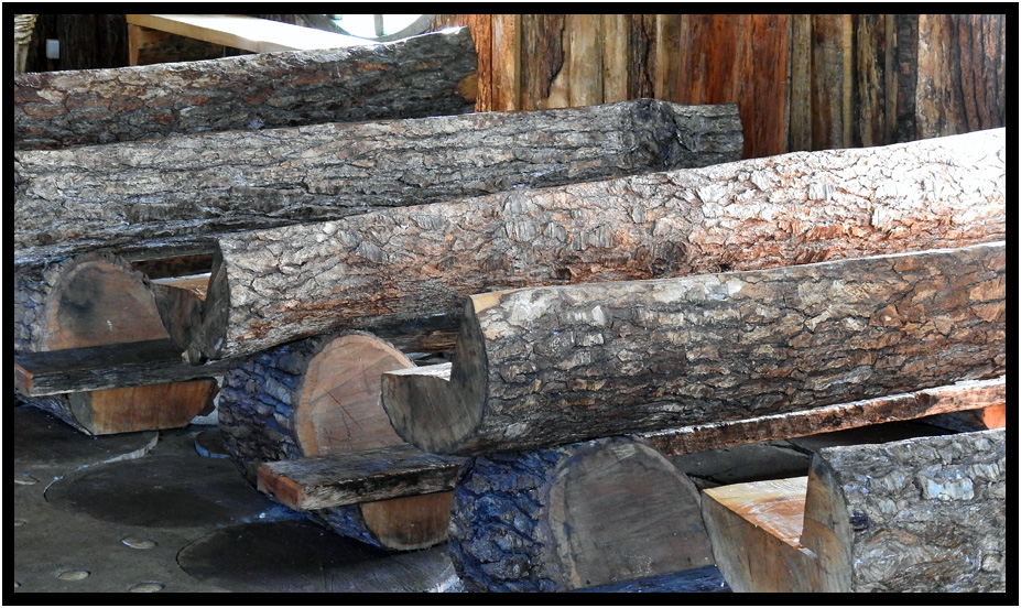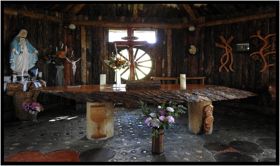 The Chapel, and it's furniture was all built out of rough hewn logs and surrounded by tall bushes and trees.