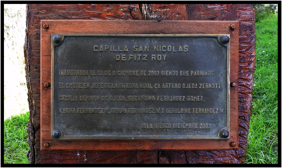 Informational sign, Capilla San Nicolas de Fitz Roy, Estancia Fitz Roy, Isla Riesco, Chile, 2024.