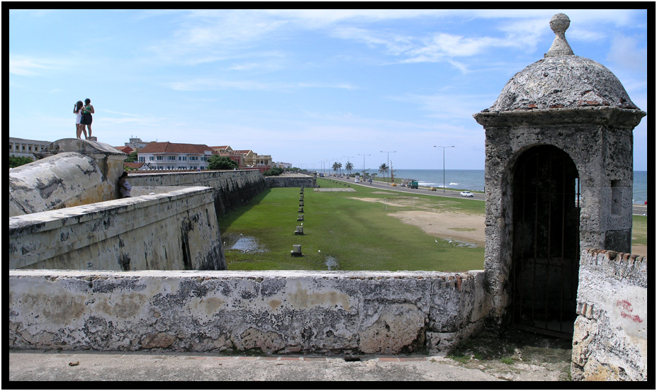 This view westward from Baluarte Santa Catalina shows the fortified wall of Old Town with the Caribbean to the right, Cartagena, Columbia, 2011.