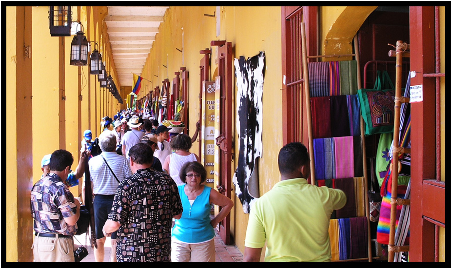 Below Baluarte Santa Catalina are the crowded arcade shops of Las Bovedas, Old Town Cartagena, Columbia, 2011.