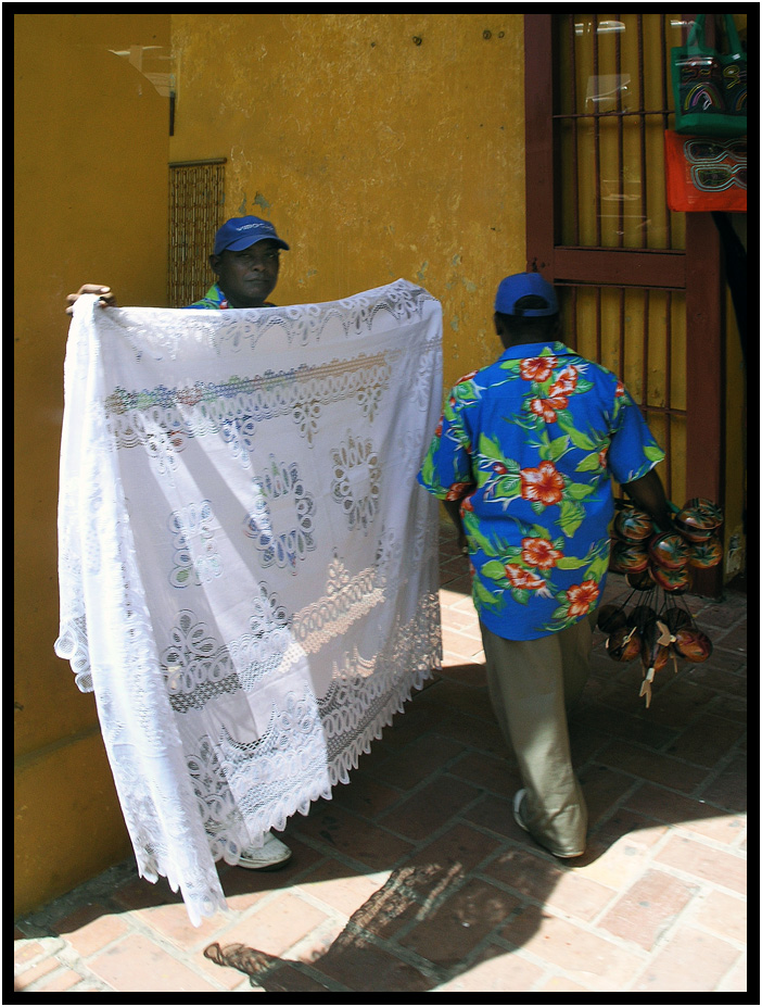 Beautiful lace work held by vendor, Las Bovedas, Old Town Cartagena, Columbia, 2011.