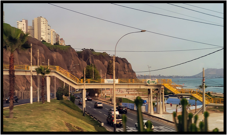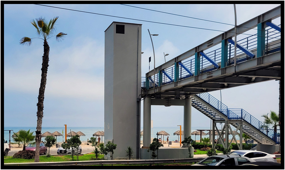 Another of the several pedestrian bridges that span the hiway between the cliffs and the beach, Costa Verde, Lima, Peru, 2024.