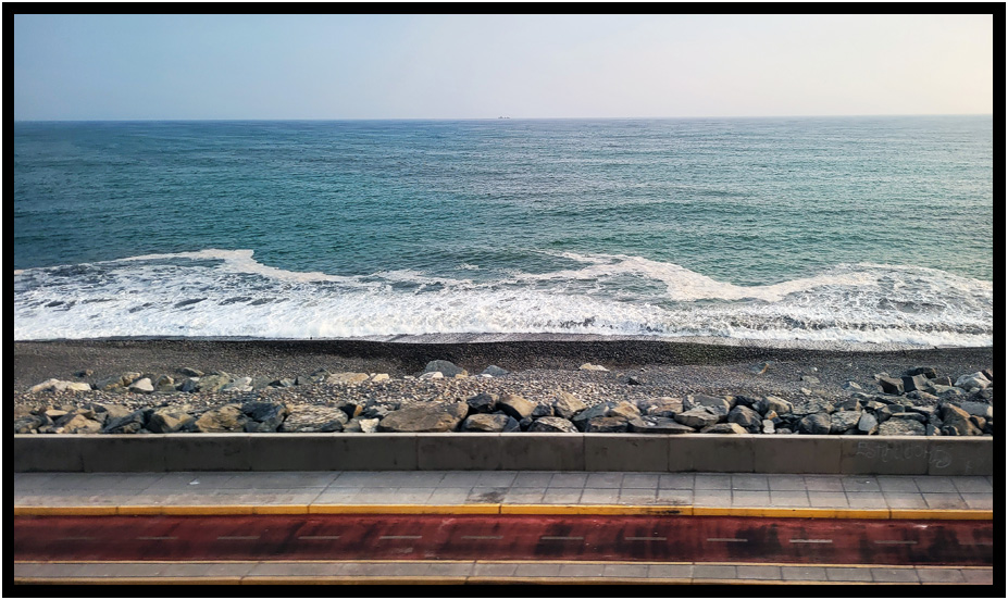 Walkway along the beach at one of the narrow spaces between hiway and beach, Miraflores District, Costa Verde, Lima, Peru, 2024.