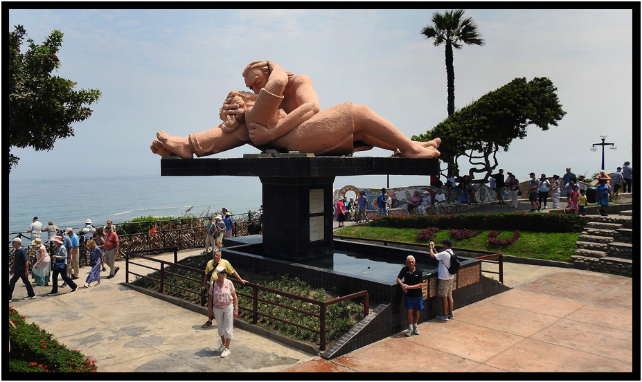 Miraflores is an upscale neighborhood of Lima filled with high-rise condos and parkways along the cliff overlooking the Pacific Ocean beyond.