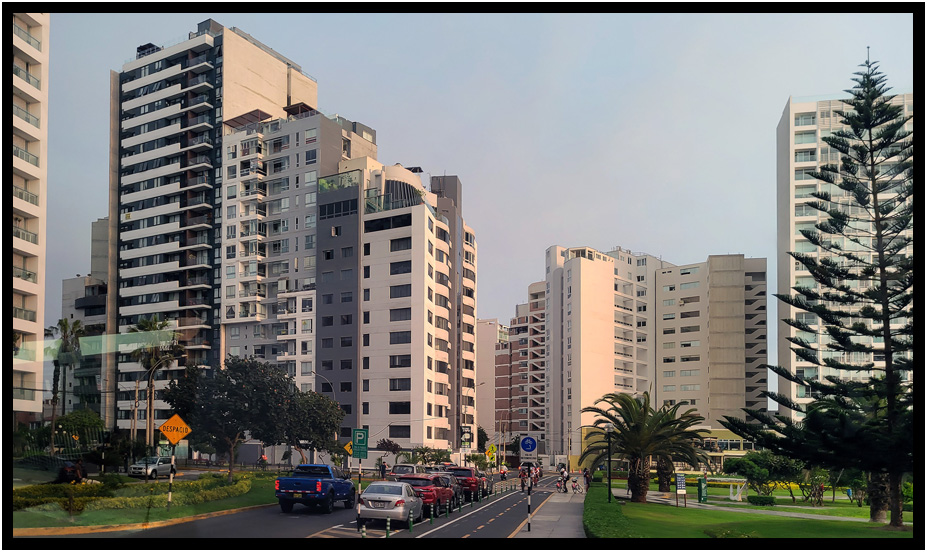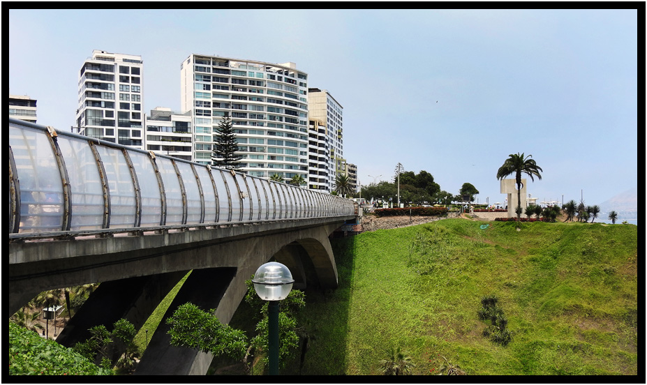 Miraflores is an upscale neighborhood of Lima filled with high-rise condos and parkways along the cliff overlooking the Costa Verde of the Pacific Ocean beyond.
