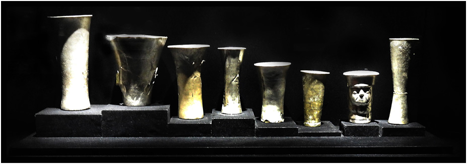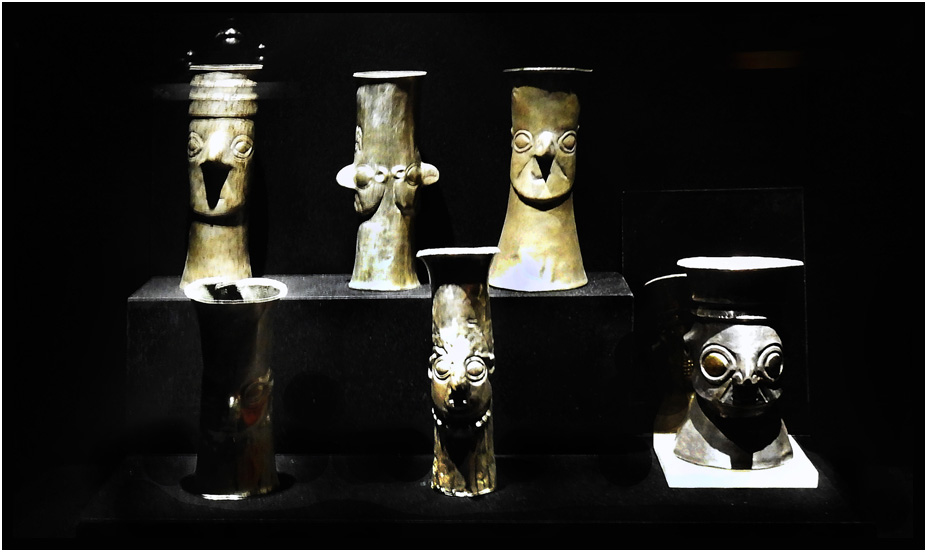 Lambayeque ceremonial vessels, Imperial Epoch (1300 AD - 1532 AD), Ceremonial Vessels exhibit, Museo Larco, Lima, Peru, 2024.