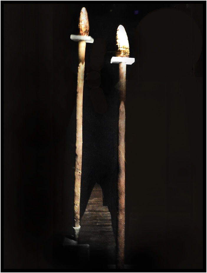 Mochica Ceremonial Scepters with golden heads shaped like ears of corn, Death in Ancient Peru exhibit, Museo Larco, Lima, Peru, 2024.