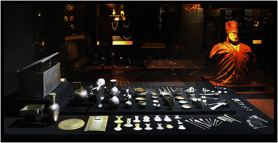 Some bundles include components known as "false heads", which were made from reeds, fiber and cloth and then painted and adorned with metal decoratons.