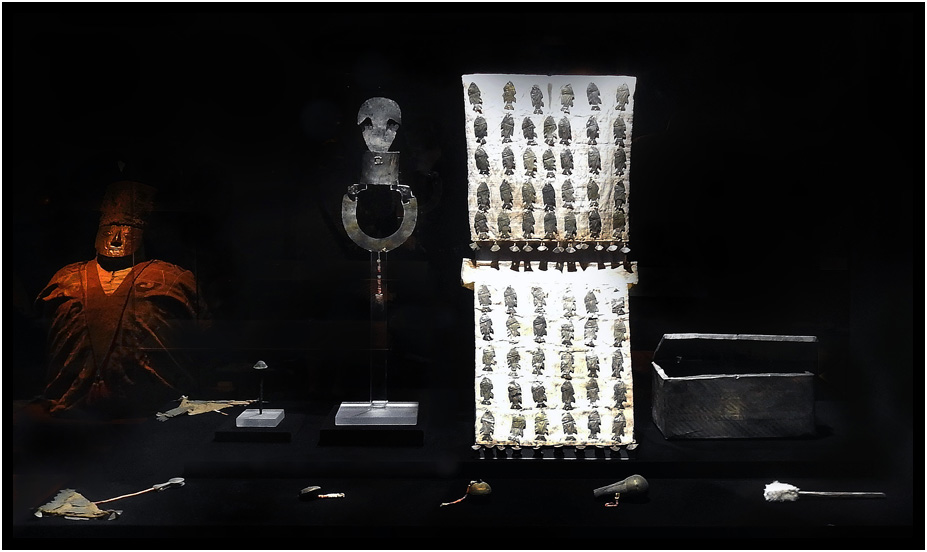 Miniature funerary offerings including a Chimu loincloth decorated with silver fish (1 AD - 1532 AD), Death in Ancient Peru exhibit, Museo Larco, Lima, Peru, 2024.